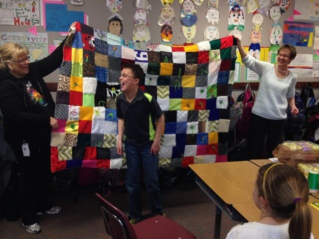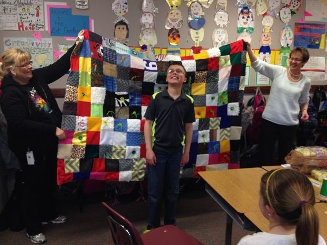 As a Mother, this gesture was honestly one of the most thoughtful and wonderful gifts he could have received. I have often worried about Nathan not being able to spend much time in the general classroom around his peers and that the other kids would start to forget about him. That is why this was such a great gift that had so much love sewn into it and for the first time I felt like Nathan has been accepted by his peers and that they have not forgotten about him. After the teachers presented it to him during class, Nathan was so happy and came home excited to show Jay the quilt that “all of his friends and teachers” made for him. That made my heart so happy because for the first time he didn’t come home and tell us that he didn’t have any friends.