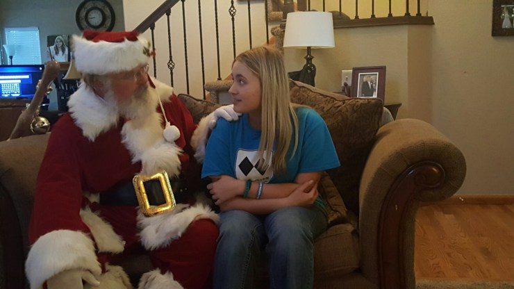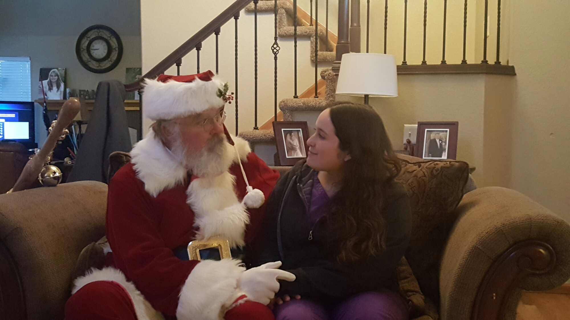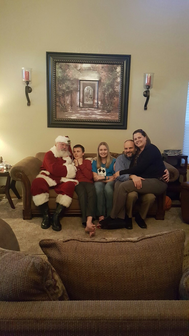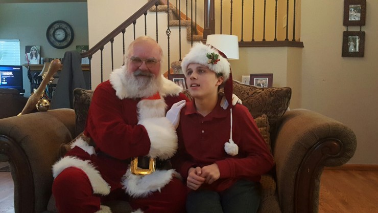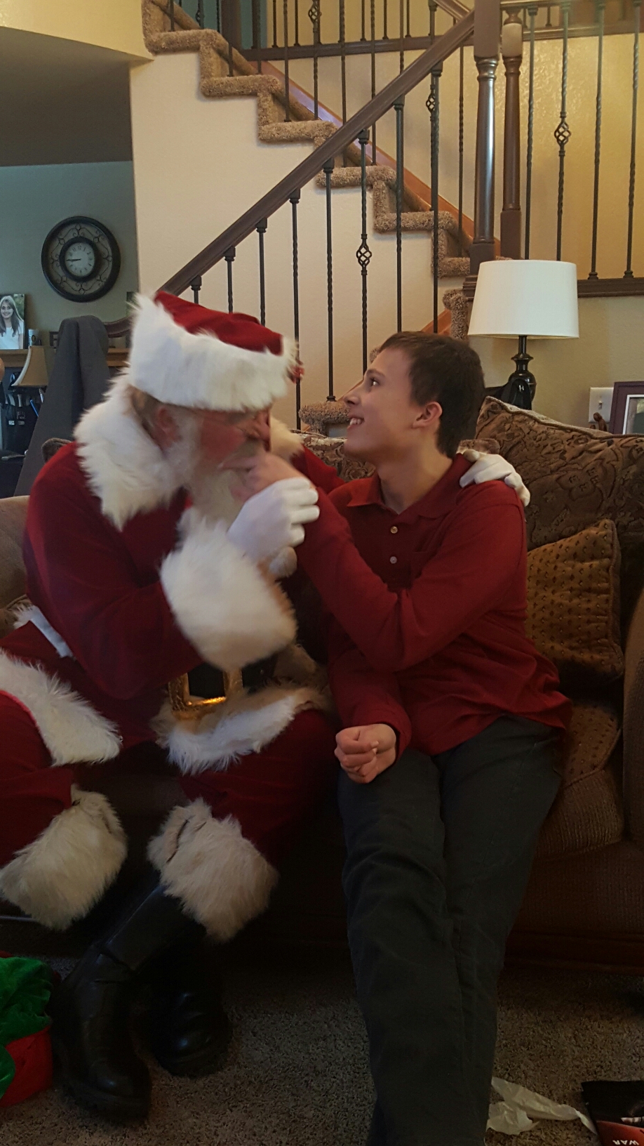 We sat in the front room and heard a loud jingling noise.  They were loud bells that Nathan heard through the front door.  He went to open the door and was so excited to hear Santa.  He came in and talked with Nathan for a very long time.  Nathan told him about how much he loved Star Wars and all the things he wanted for Christmas. He has not been to see Santa since he was 4, and he was having a hard time remembering his list.  Nathan tells us something new everyday that he wants and I think it was hard on the spot to remember everything.   He just kept saying “I want something I have never had”.  He felt Santa’s beard and buckle and gloves.  They talked about his Reindeer and his elves.  Nathan asked Santa where something was and he replied in his truck.  You could see the wheels turning in Nathan’s head and quickly said, you have a truck?  Santa was quick and said “Have you ever heard of Uber?”.  It was really funny.